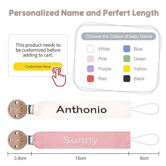 TYRY.HU Personalized Pacifier Clip with Name, Embroidery Pacifier Holder for Baby Girls and Boys, Neutral Binky Clips Universally Fit All Pacifiers & Baby Toys, Baby Gift, 2 Pack(Beige,Pink)