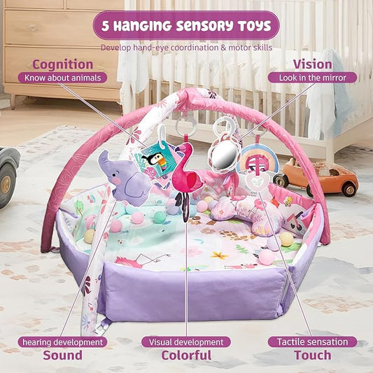 5-in-1 Plush Baby Play Gym, Baby Play Mats, Convertible Baby Gym with Pillow, Tummy time mat, Baby&Ped Bed, 6 Sensory Toys, Activity Center from Newborn to Toddler, Ball Pit, Rectangular Pink