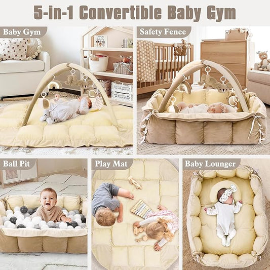 5-in-1 Plush Baby Play Gym, Baby Play Mats, Convertible Baby Gym with Pillow, Tummy time mat, Baby&Ped Bed, 6 Sensory Toys, Baby Activity Center from Newborn to Toddler, Ball Pit, Rectangular Cream