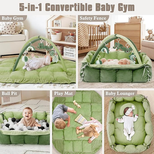 5-in-1 Plush Baby Play Gym, Baby Play Mats, Convertible Baby Gym with Pillow, Tummy time mat, 6 Sensory Toys, Baby Activity Center from Newborn to Toddler, Pet Bed, Cat & Dog Bed, Ball Pit, Green