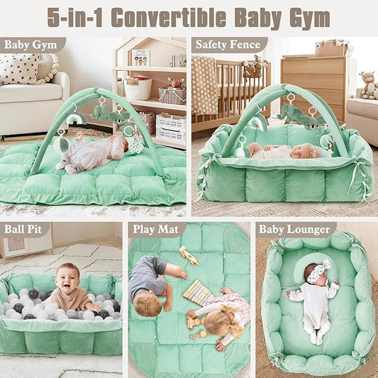 5-in-1 Plush Baby Play Gym, Baby Play Mats, Convertible Baby Gym with Pillow, Tummy time mat, Baby&Ped Bed, 6 Sensory Toys, Activity Center from Newborn to Toddler, Ball Pit, Rectangular Sage Green