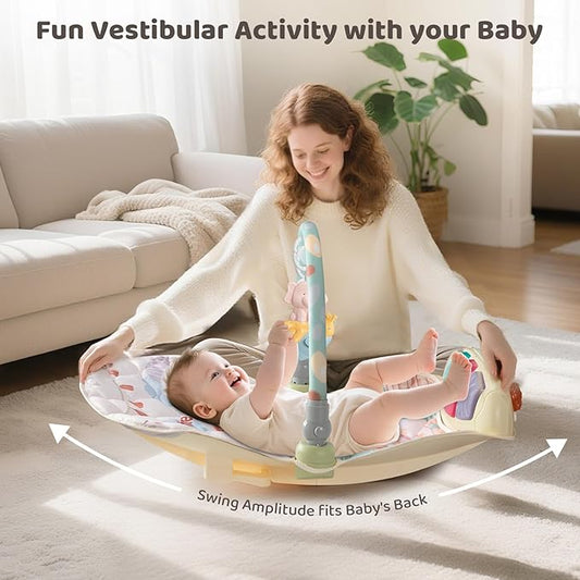 Baby Play Gym Mat with Multifunction Piano Music Box, Rocking Egg-Shaped Baby Activity Gym, Baby mat for floor with 4 Hanging Sensory Baby Toys, Early Sensory Development Play Mat for Infant & Newborn
