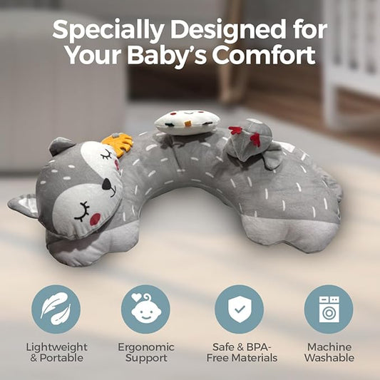 Tummy Time Pillow with 3 Detachable Sensory Toys - Infant Head Support & Neck Strengthening Mat - Soft & Breathable Baby Gym Play Pillow - Machine Washable (Gray Fox)