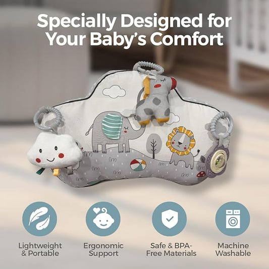 Tummy Time Pillow with 3 Detachable Sensory Toys - Infant Head Support & Neck Strengthening Mat - Soft & Breathable Baby Gym Play Pillow - Machine Washable (Safari Animals)