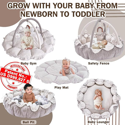 5-in-1 Convertible Baby Play Gym with 6 Toys, Tummy Time Mat for Sensory Development, Baby Activity Center from Newborn to Toddler, Ball Pit, Cat & Dog Bed, Soft Plush Pet Bed, No Ball Included