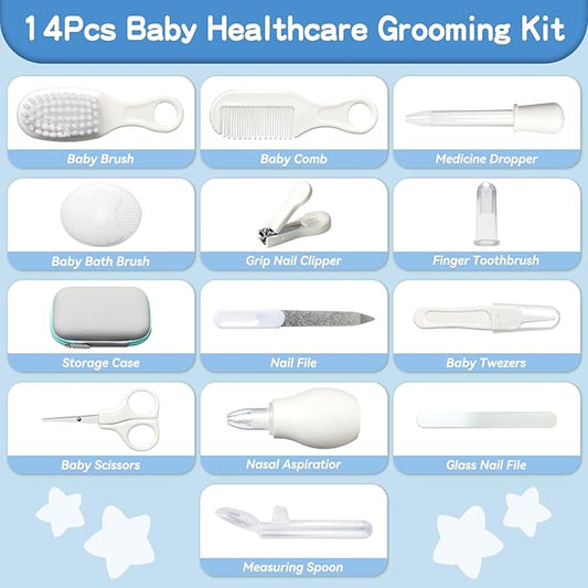 Baby Healthcare and Grooming Kit, 14 in 1 Baby Safety Set Newborn Nursery Health Care Set with Hair Brush Scale Nail Clippers for Baby Girls Boys (14 Kits Grey White)
