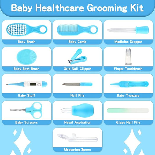 Baby Healthcare and Grooming Kit, 14 in 1 Baby Safety Set Newborn Nursery Health Care Set with Hair Brush Scale Nail Clippers for Baby Girls Boys (Blue 14 in 1)