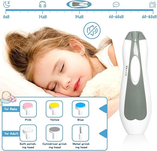Baby Nail File Electric, Gentle Rechargeable Nail Trimmer, Baby Nail Clippers Grooming Kit Manicure Set for Infant Toddler or Adults, 6 Grinding Head Replacement Pads White
