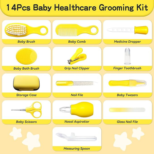 Baby Healthcare and Grooming Kit, 14 in 1 Baby Safety Set Newborn Nursery Health Care Set with Hair Brush Scale Nail Clippers for Baby Girls Boys(14 Kits Yellow)