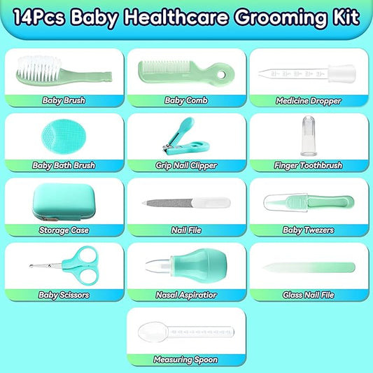 Baby Healthcare and Grooming Kit, 14 in 1 Baby Safety Set Newborn Nursery Health Care Set with Hair Brush Scale Nail Clippers for Baby Girls Boys(14 Kits Green)