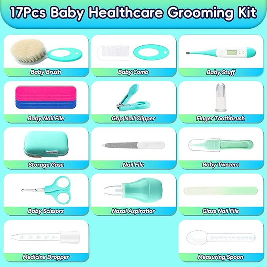 Baby Healthcare and Grooming Kit, Baby Safety Set Newborn Nursery Health Care Set with Hair Brush Scale Measuring Spoon Nail Clippers (17pcs, Green)
