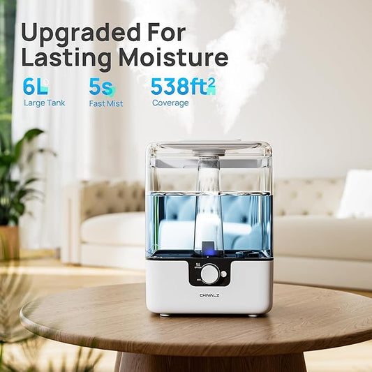 CHIVALZ 6L Humidifiers for Bedroom Large Room Home, Cool Mist Top Fill Humidifiers for Baby Nursery and Plants, 26dB Quiet, Nightlight, Up to 50 Hours, Oil Diffuser 1 Pack + 2 Mist Outlets White
