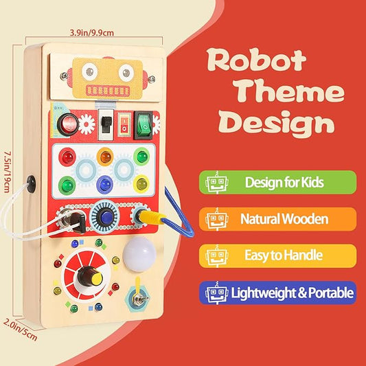 Asweets Montessori Wooden Busy Board Toy for Toddler, Red Robot Sensory Board with 8 LED Shape Light Switches, Travel & Gift Toys for Kids, 3.9''L x 2.0''W x 7.5''H
