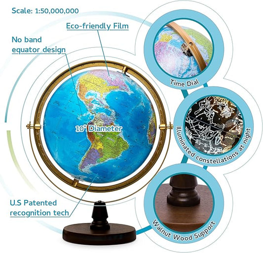 with Interactive APP & LED Illuminated Constellations at Night, US-Patented STEM education 10" World Globe with Detailed map