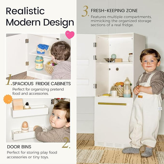 Tiny Land Wooden Toy Fridge with Spacious Storage, Realistic Play Kitchen Refrigerator for Kids’ Pretend Play with Three Freezer Magnets