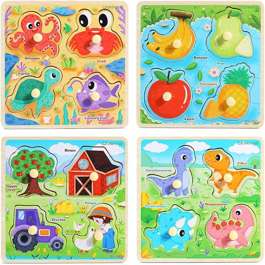 GRINNNIE Wooden Toddler Puzzles, 1 2 3 Years Old Learning Montessori Peg Puzzle Toy Set for Toddlers, 4 Pcs Educational Portable Size Travel Knob Puzzle Toys, Gift for 1-3 Boy Girl Birthday Christmas
