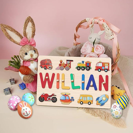 Personalized Name Puzzle for Kids, Custom Wooden Name Puzzle for Toddlers 1-3, Personalized Baby 1st Easter Gifts for Kids, Alphabet Puzzle Engraved Text On Back with Pegs, Toddlers Toys