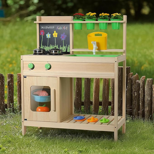 BlueWood Mud Kitchen for Kids Outdoor, Wooden Play Kitchen Set with Sink, Stove, Chalkboard, Montessori Toddler Outdoor Kitchen Playset for Backyard Fun