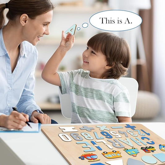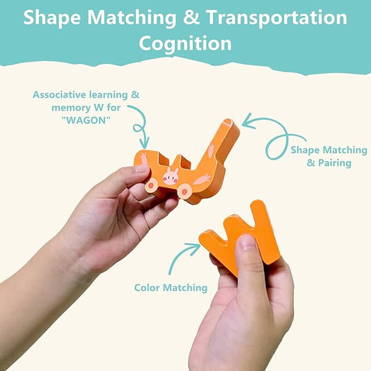 52 Pieces Wooden Alphabet Transportation Puzzle for Kids Ages 3+, ABC Learning Toys with Vehicles, Montessori Educational Toy for Toddlers, CPC Certified Alphabet Blocks for Boys and Girls