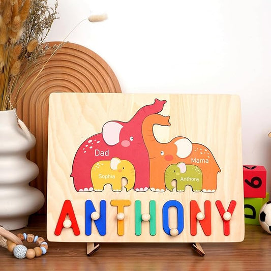 Name Puzzles for Toddlers 1-3, Personalized Name Puzzle with Elephant Family Wooden Puzzle for Toddlers 1-3, First Birthday Gifts for Boys Girls, Personalized Gifts for Mom Dad Kids, Baby Learning Toy