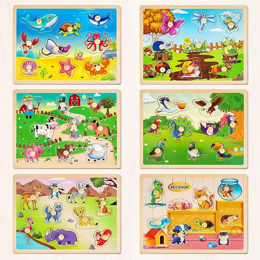 SYNARRY Wooden Puzzles for Toddlers 1-3, 6XSET Animals Puzzles for Toddlers 2-4 with Rack, Toddler Puzzles Ages 2-4, Kids Learning Educational Montessori Toys for 2 3 Year Old, Gifts for Boys Girls