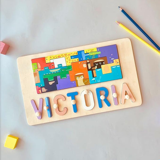 Name Puzzle for Kids Personalized, First Birthday for Baby Boy Girl, Wooden Name Puzzles for Toddlers 1-3, Educational Toys for 1 Year Old (Cute Animal)