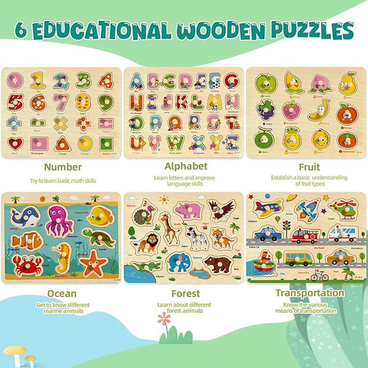 Wooden Peg Puzzles for Toddlers 2-4, 6 Pack Educational Peg Puzzles Montessori Toys, Learning Puzzles for Kids Girs Boys 1-3 3-5 with Alphabet Number Animal Vehicle Shape