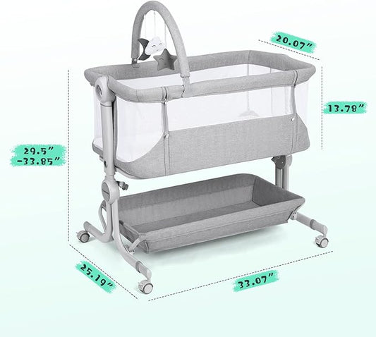 Cowiewie Baby Bassinet Bedside Sleeper with Storage Basket,Wheels and Toys, Easy Folding Portable Bassinet with Wheels Adjustable Height Portable Bassinets for Newborn