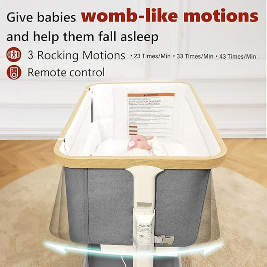 Rocking Bassinet for Baby Electric Automatic Bedside Sleeper Rocks Itself 3 Motion Auto Rolling Newborn Cradle 5 Height Adjustable with Music, Wheels, Storage, Dark Grey