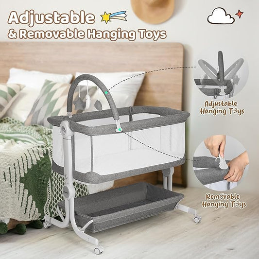 Cowiewie Baby Bassinet 2-1 Beside Sleeper with Wheels & Hanging Toys for Baby Foldable Adjustable Height Portable Bassinets (GREY)