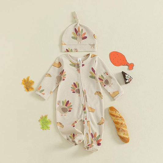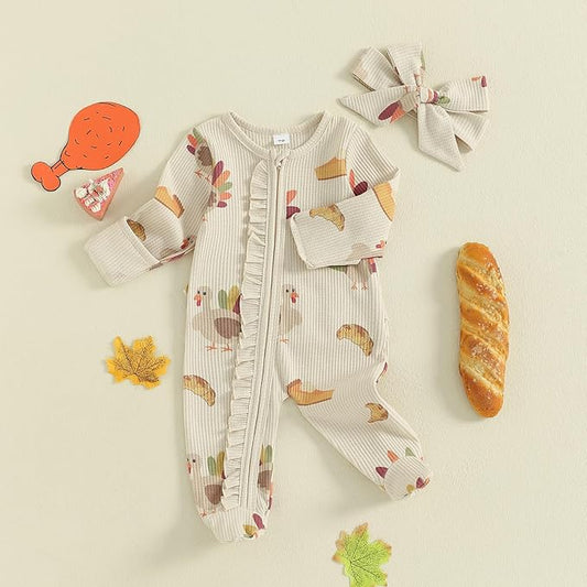 Userdefined Baby Girl Thanksgiving Outfit Ruffle Romper Turkey Rolls Print Onesie Footie Jumpsuit Fall Winter Clothes