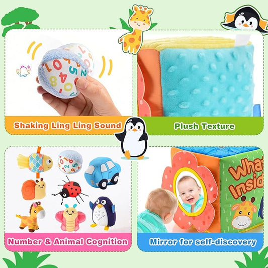 Baby Toys 6-12 Months, Mystery Montessori Sensory Soft Box Toy with 8 Stuffed Animals for 6 7 8 9 10 12 Month Old Babies Girl Boy Gifts Learning Busy Boxes Birthday for Infant & Toddler