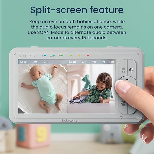 Babysense 5" HD Split-Screen Baby Monitor, Video Baby Monitor with 2 Cameras and Audio, Night Light, 1000ft Range, Two-Way Audio, 4X Zoom, Night Vision, 4000mAh Battery