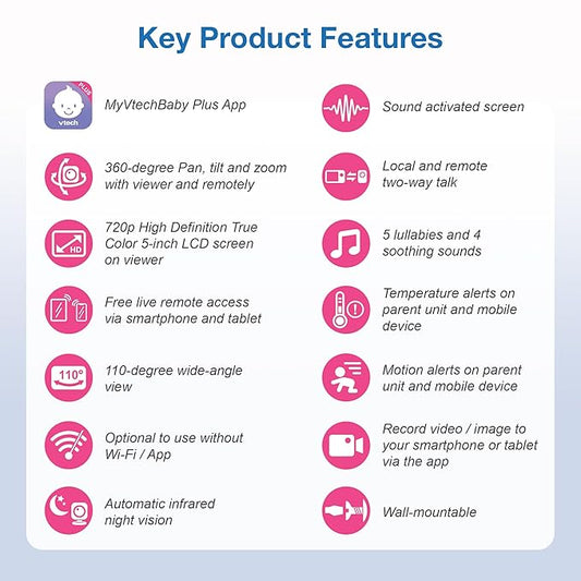VTech Upgraded Smart WiFi Baby Monitor, 1080p FHD Camera and 5" HD IPS Display, Free App with Motion Video, Sound/Motion Detection and Notifications, Fully Remote Pan-Tilt-Zoom: VM901