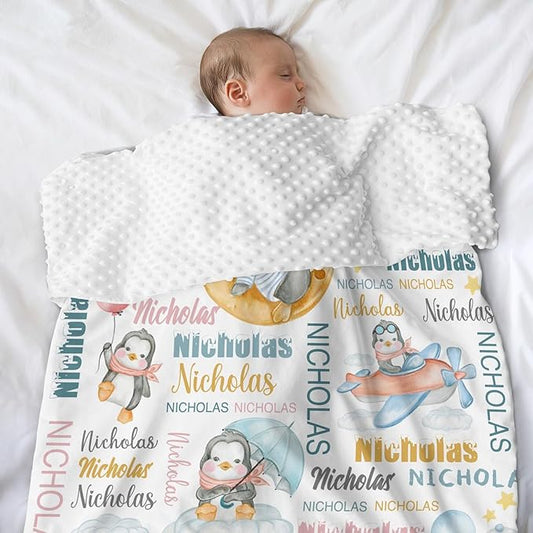 Personalized Baby Blanket for Girls Boys Penguin Custom Baby Blankets with Name Dotted Backing Customized Gifts for New Mom Customize Baby Blanket for Kids Newborn Birthday