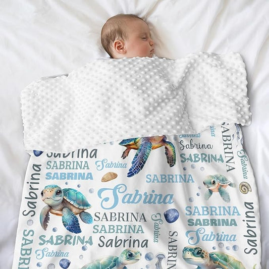 Personalized Baby Blanket for Boys Girls Turtle Custom Baby Blankets with Name Dotted Backing Customized Gifts for New Mom Customize Baby Blanket for Kids Newborn Birthday Blue