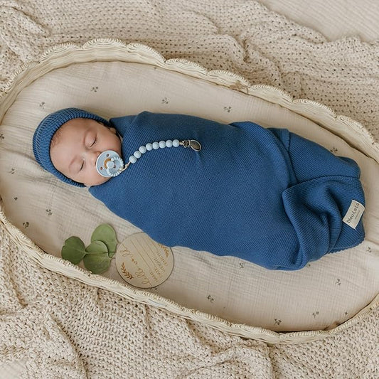 Luxe Collection 100% Organic Cotton Luxury Knit Baby Blanket + Hat Set (Denim Blue)