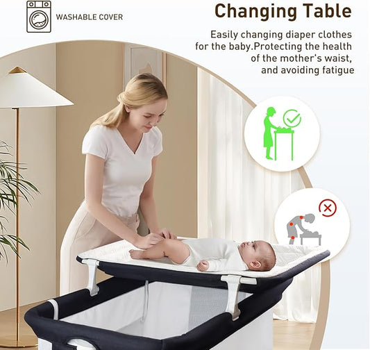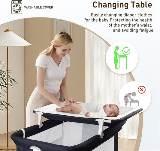 4 in 1 Bedside Bassinet for Baby, Portable Bassinets with Wheels, Baby Crib with Changing Station, Mattress Included and Storage, Foldable Travel Bassinet for Infant/Newborn- Black- Half Mesh