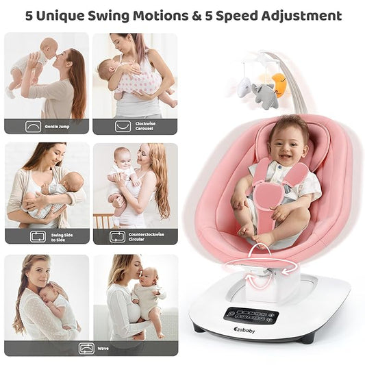 Ezebaby Baby Swing for Infants and Newborns with 5 Unique Motions, Adjustable Speed and Positions, Lullabies, Infant Swing with 5-Point Harness, Baby Swing for Newborn Babies 0-9 Months Pink