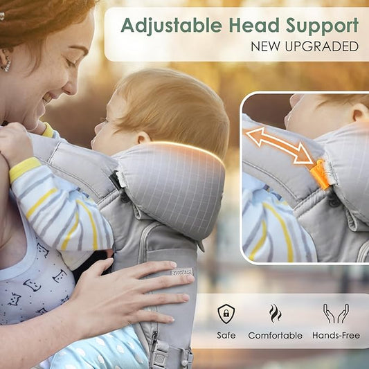 SUNVENO 3 in 1 Ergonomic Baby Carrier with Hip Seat for Newborns and Toddlers, Supports 20 lbs and Up, Waist and Back Relief with Large Weight Capacity for All Season Use, Grey