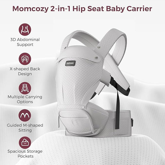 Momcozy Hip Seat Baby Carrier - Adjustable Waistband with Original 3D Belly Protector, Ergonomic Carrier with Various Pockets for Newborns & Toddlers up to 45lbs (Grey, Large)