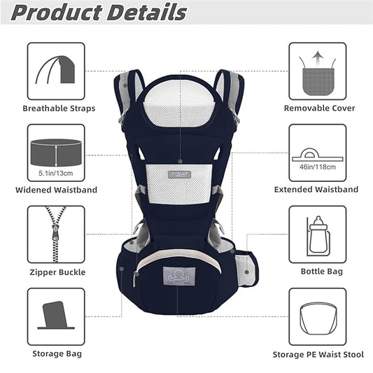 Baby Carrier with Hip Seat, YIYUNBEBE 6-in-1Baby Carrier Newborn to Toddler, Adjustable Detachable Infant Baby Holder Carrier for 7-44lbs, All Seasons Dark Blue