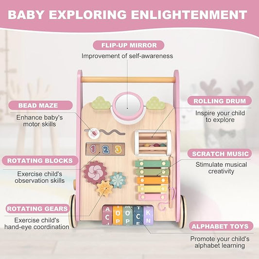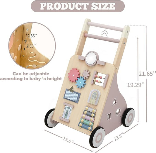 Wooden Baby Walker, Baby Push Walker Adjustable Height and Speed Multiple Learning Activity Walker Baby Walker with Wheels for Girls 6-12 Months, Pink