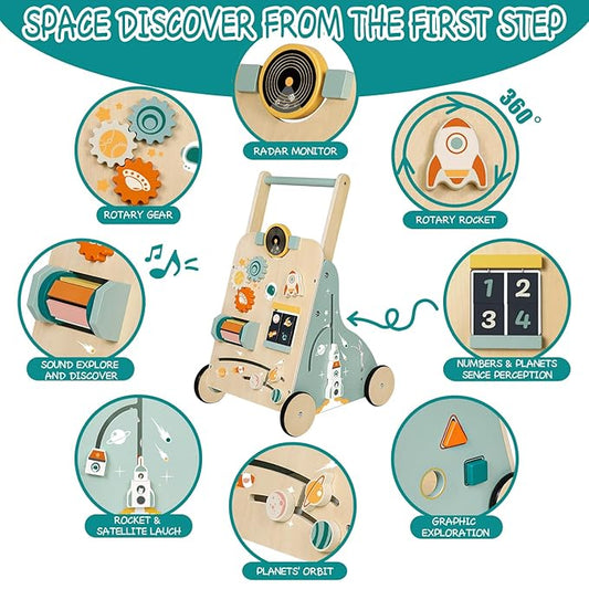 Adjustable Wooden Baby Walker – Montessori Push Toy for 1 Year Old with Rocket-Themed Activity Center, Sit-to-Stand Walker Gift for Boys and Girls