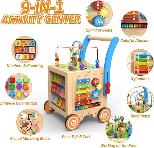 9-in-1 Wooden Activity Cube | Wooden Baby Walker, Sit-to-Stand Learning Walker Activity Center, Early Educational Push & Pull Toys for Baby Toddler Boys Girls, Height & Brake Adjustable