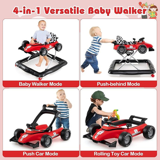 BABY JOY 4-in-1 Baby Walker, Foldable Activity Walker with Push Mode, Adjustable Height, Lights, Anti-Rollover, Baby Walker with Wheels for Boys Girls 6-18 Months (Red)