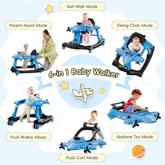 Xilingol 6-in-1 Baby Walker with Wheels, Adjustable Height & Speed Activity Walker with Padded Seat, Foldable Walker for Babies, Toddler Push Walkers for Boy & Girl 6-18 Months, Music & Light