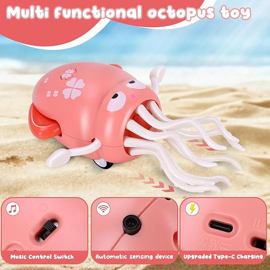 Dancing Octopus Baby Toy, Tummy Time Toys, with Music and Led Light, Automatically Avoids Obstacles, Crawling Toy Suitable for Birthday Gifts for Toddlers Over One Month Old(Pink)
