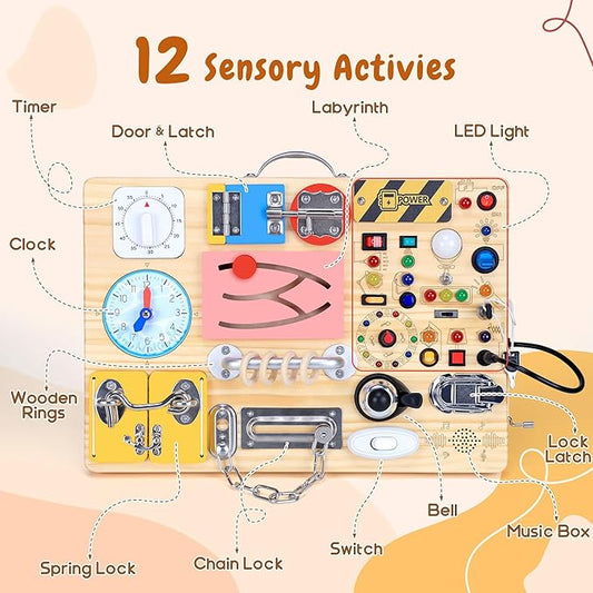 25 in 1 Busy Board with 13 LED Light Switches and 12 Activity, Montessori Toys for 1 2 3 Years Old, Wooden Sensory Board, Toddlers Travel Toys for 1+ Year Old Boy & Girl Birthday Gift(Extra-Large)
