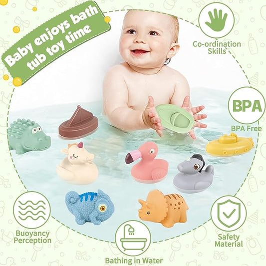 Bath Toys for Babies, 9 Pack Mold Free & No Hole Bath Toys with Rubber Floating Boats & Animals, Toddlers Bathtub Water Play Toys for Baby Gifts